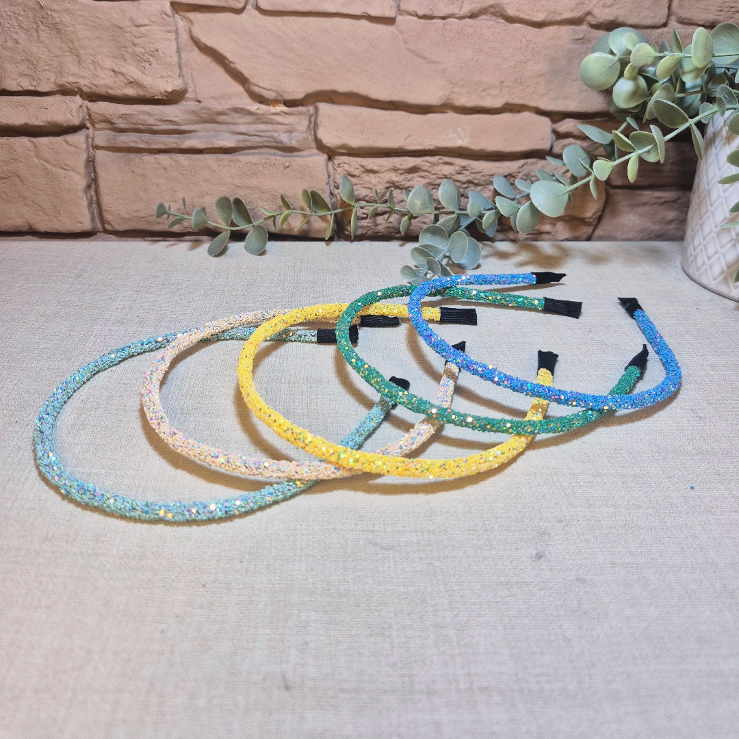 Estas diademas con glitter en tonos alegres son perfectas para dar un toque divertido y luminoso al look de las peques 💛💙💚.