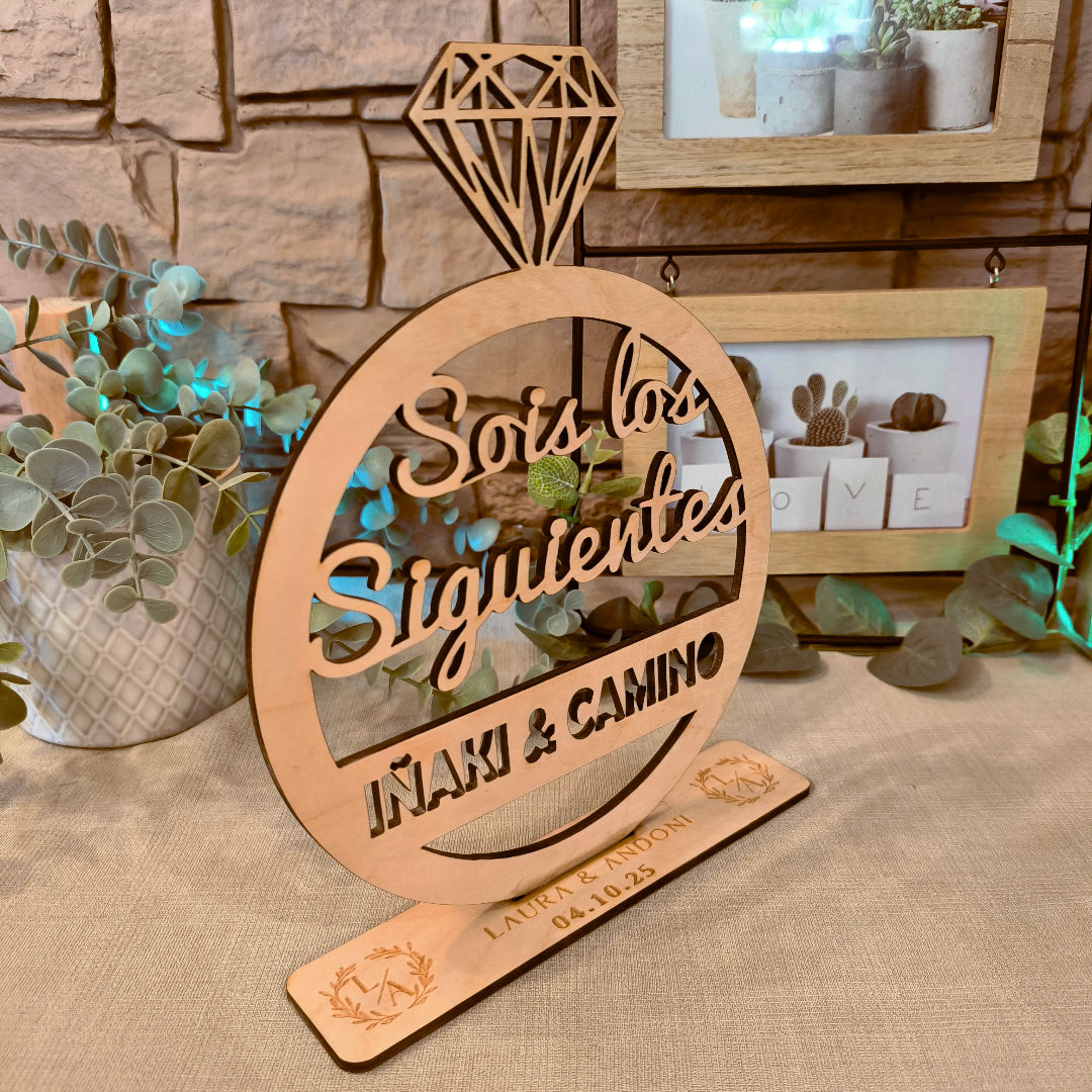 Un detalle único y original para sorprender en bodas, pedidas o celebraciones especiales. Este regalo en madera combina diseño, personalización y un acabado elegante que lo convierte en un recuerdo inolvidable.