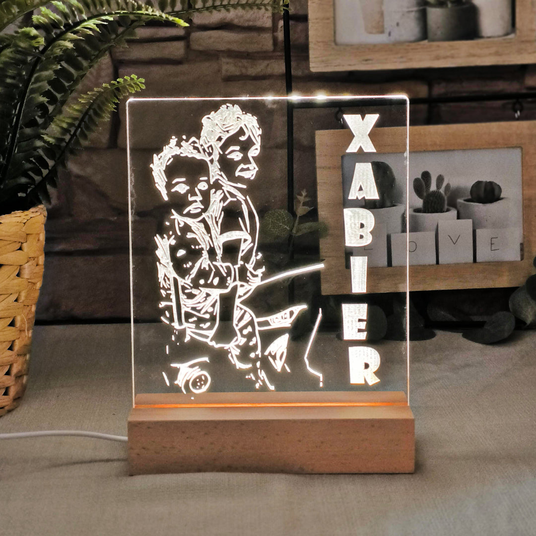 Ilumina tus momentos más especiales con esta lámpara de metacrilato personalizada, diseñada para proyectar recuerdos únicos con una luz LED cálida y acogedora. Su base de madera elegante y su acabado moderno la convierten en el detalle perfecto para decorar cualquier espacio.