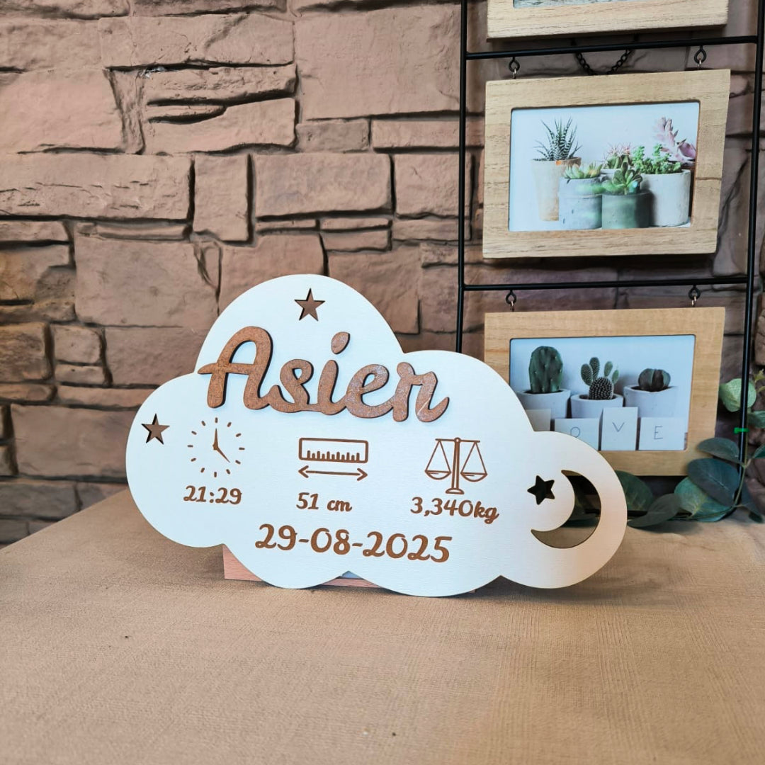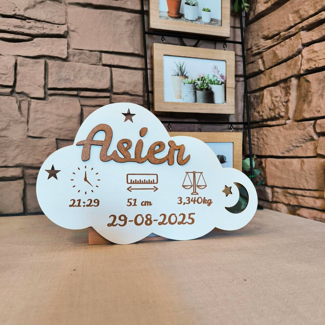 - Placa de madera personalizada con nombre y datos de nacimiento.