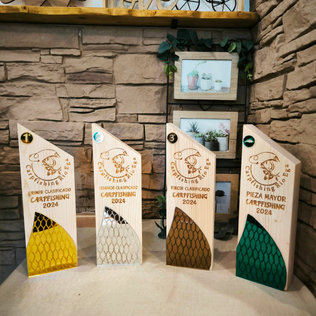Trofeo Carpfishing rio Ega combinacion Madera + Metraquilato espejo grabado