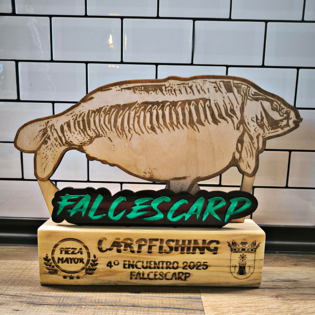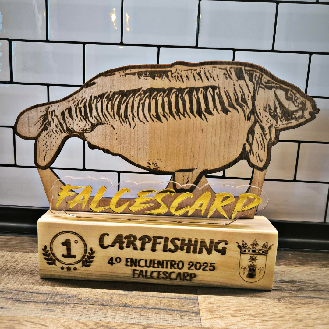 Trofeo pesca combinacion Madera + Metraquilato espejo grabado