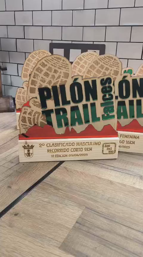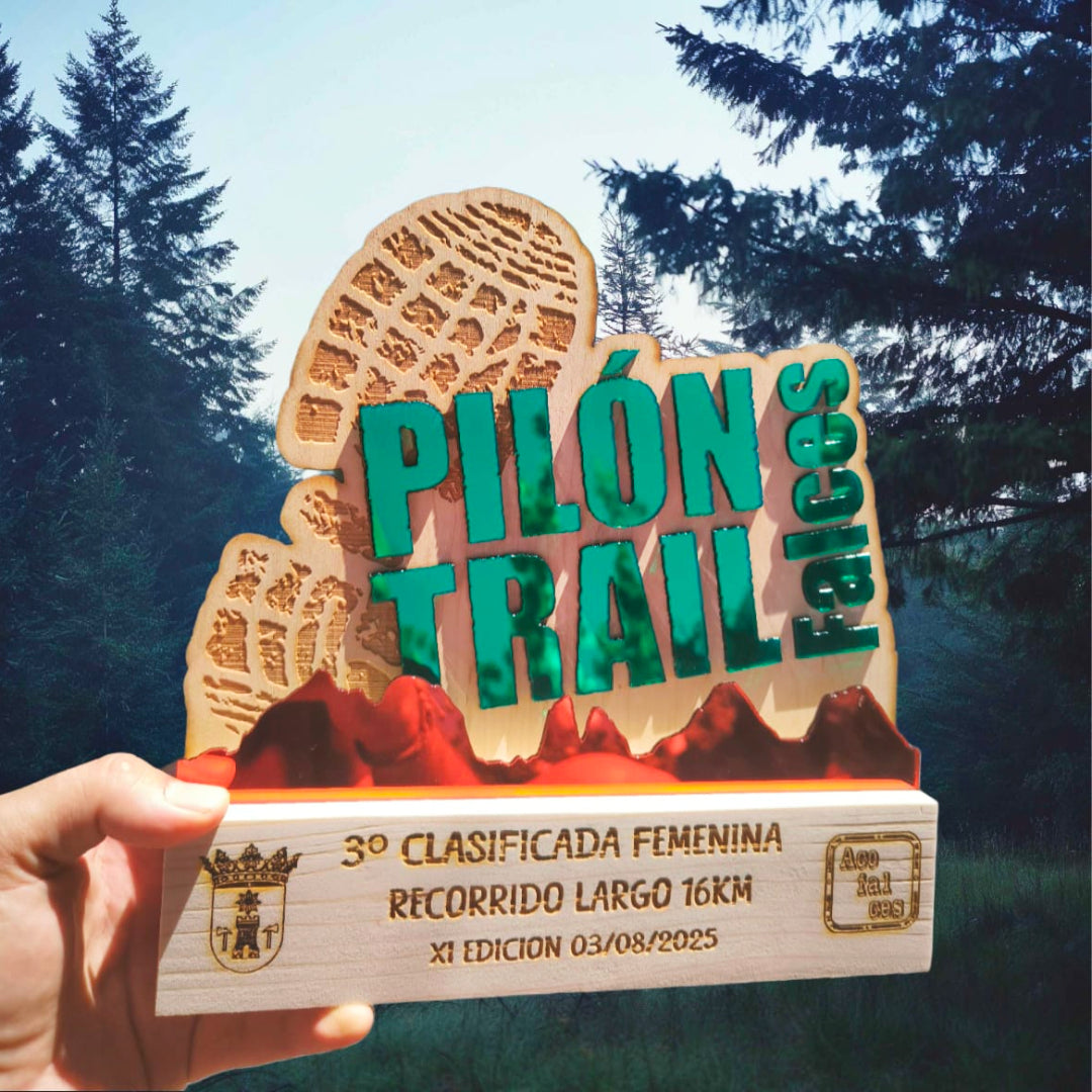 Trofeo Trail Pilon combinacion Madera + Metraquilato espejo grabado